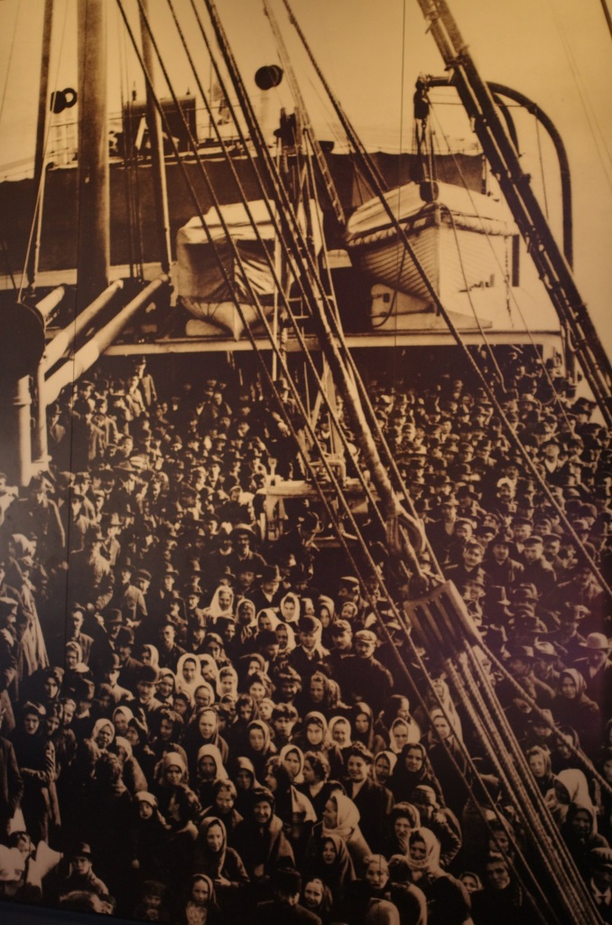 L'arrivée des gens ici a trés souvent pour source les violences religieuses et la faim. Le parcours en bateau aboutit à ce poste d'immigration mais avant le parcours à travers l'Europe est impressionnant. Le commentaire d'un arrivant montre qu'il est parti de Budapest pour Vienne, il rejoint Zurich pour aller directement à Paris. Le port de départ du bateau est au Havre. Le billet pour avoir une place confortable est hors de prix donc le voyage se passe dans l'entrepôt. Beaucoup de gens préfèrent le pont car l'air est frais et l'odeur moins presente.